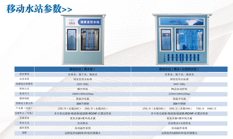 移動水站是一種專門針對人群數量較(jiào)多的場合特別是小區、學校、工(gōng)廠、超市、鄉村設(shè)計的高新技術節能產品,它極其(qí)有效地解決了飲水費用(yòng)高(gāo)、不衛生、飲水困難,設備無泵房放置等問題。