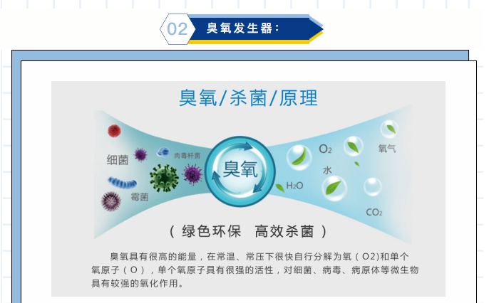 普通氧原子(O2)對各(gè)種細菌(包括肝炎(yán)病毒,大腸杆菌,綠濃杆菌(jun1)及雜菌等)有極強的殺(shā)滅能力。
