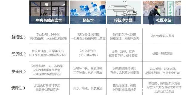 相較於桶(瓶)裝水和進口淨水器,管道直飲水的供水價格反而要低。根據(jù)產業研究智庫《中(zhōng)國管(guǎn)道直飲水行業(yè)發展現狀及未來前景趨(qū)勢》數據可知,一般瓶裝水的市場(chǎng)價格在2-3元每瓶(550ml),桶裝水的市場價格在0.4-0.8元(yuán)/升,而管(guǎn)道直飲水的市場價格在(zài)0.2-0.3元/升。直飲水由於免去了訂(dìng)水、送水、換水等程序,價格更具優勢,使(shǐ)用場景(jǐng)也更多樣。除可直飲外,還可用於做飯、煮湯、清洗水果等其他用途(tú),更加經濟(jì)實惠。